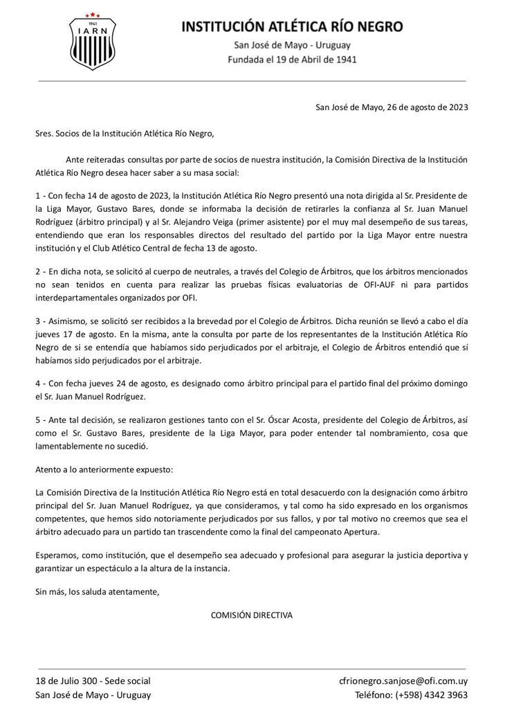Río Negro emitió un comunicado previo a la final del torneo Apertura sobre la designación del árbitro Juan Manuel Rodríguez.