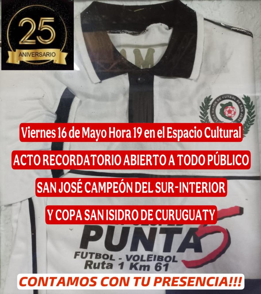 A 25 años de una de las gestas más recordadas del deporte maragato, San José conmemora la doble consagración obtenida en 1999: el título de campeón del Sur-Interior y la Copa San Isidro de Curuguaty. La cita será este viernes 16 de mayo a las 19 horas en el Espacio Cultural de San José de Mayo, con un acto abierto a toda la comunidad.
